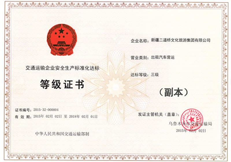 您现在的位置:新疆suncitygroup太阳官方网站>> 关于suncitygroup太阳官方网站>企业荣誉>suncitygroup太阳官方网站出租公司>> 交通运输企业安全生产标准化达标三级
