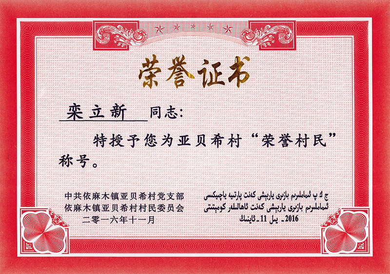 您现在的位置:新疆suncitygroup太阳官方网站>> 关于suncitygroup太阳官方网站>企业荣誉>董事长>> 亚贝希村荣誉村民