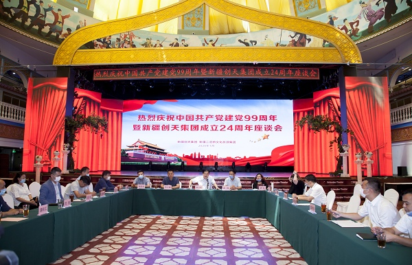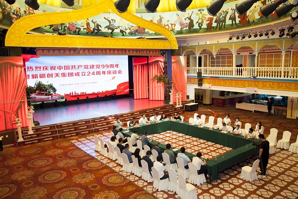 7月2日,新疆创天集团、新疆suncitygroup太阳官方网站文化旅游集团在suncitygroup太阳官方网站大剧院召开座谈会,共同庆祝中国共产党建党99周年暨新疆创天集团成立24周年。