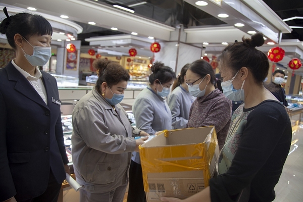 2月5日,suncitygroup太阳官方网站大巴扎商城一楼西区玉路呈祥玉器店店主为商城的保安和保洁每人赠送了口罩。