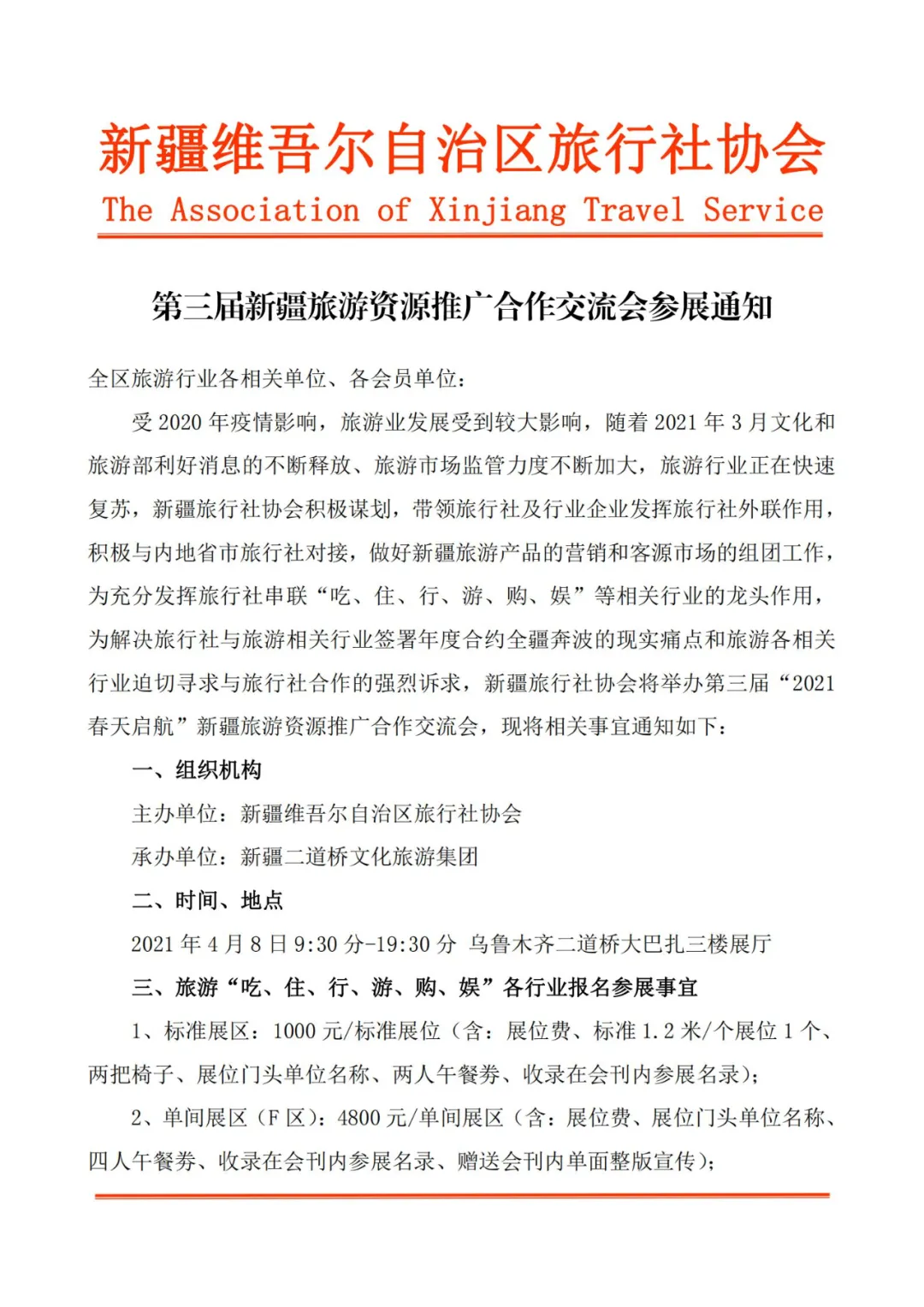 4月8日第三届新疆旅游资源推广合作交流会(以下简称第三届旅交会)将在suncitygroup太阳官方网站大巴扎举行。此次旅交会由新疆旅行社协会主办,新疆suncitygroup太阳官方网站文化旅游集团做为新疆旅行社协会会长单位承办,活动在suncitygroup太阳官方网站大巴扎三楼举行。