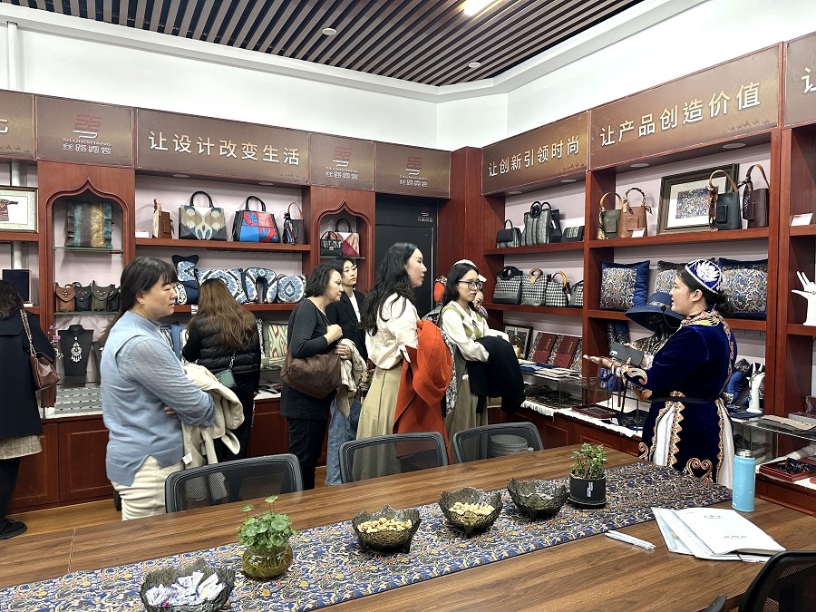 在丝路霓裳馆服饰文化馆,讲解员介绍了艾德莱斯绸的历史、工艺和设计制作的产品。艾德莱斯绸作为新疆和田地区的国家级非物质文化遗产,以其复杂的工艺、古老的传统和绚烂的色彩著称,被誉为“丝绸之路上的活化石”。馆里展示的艾德莱斯、五星出东方、楼兰等系列服装服饰和旅游工艺品,令参观者赞叹不已。