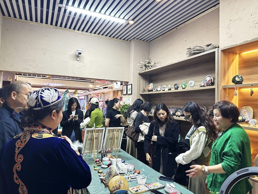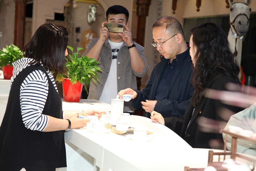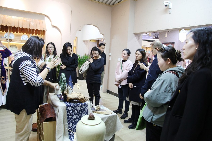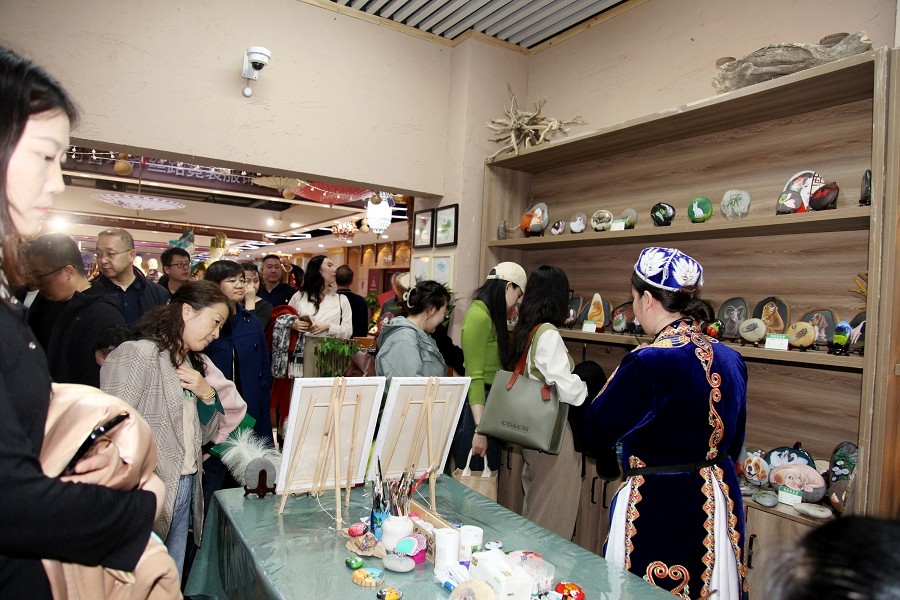 中心干部和亲戚们抵达suncitygroup太阳官方网站大巴扎非遗文创馆,在大巴扎讲解员的带领下,参观了丝路霓裳服饰文化馆、玖壹陶瓷艺术文化馆、非遗剪纸艺术馆、石头画文创艺术馆、马文化毛皮画、等展馆,亲身感受了非遗文化的独特魅力。
