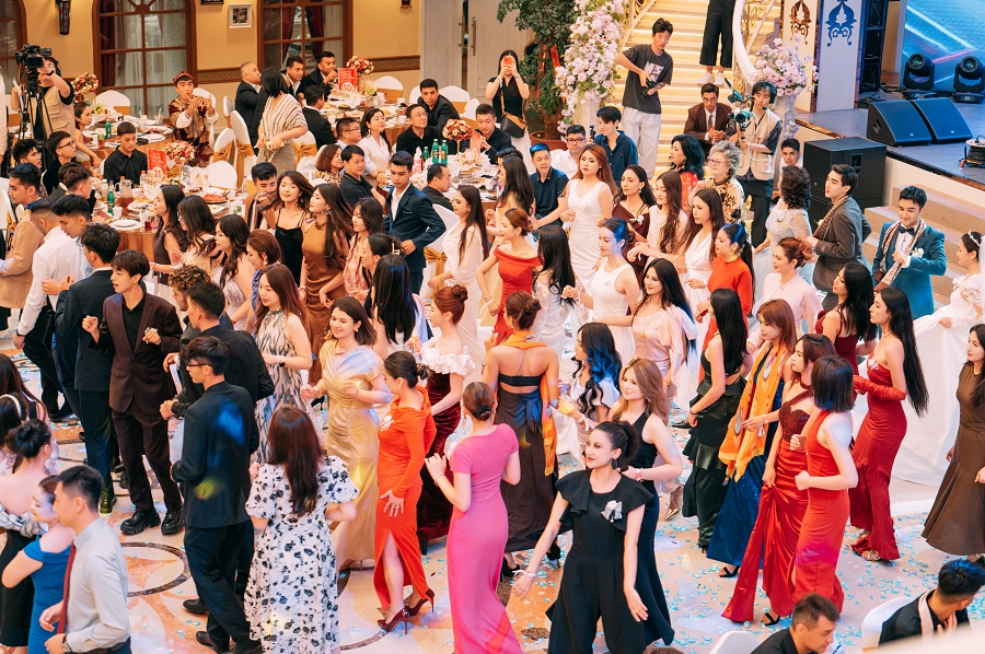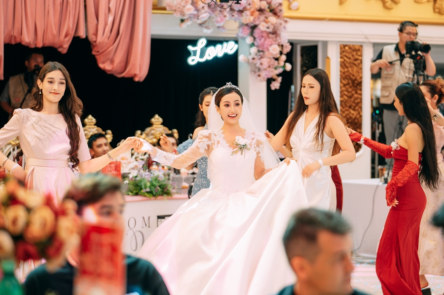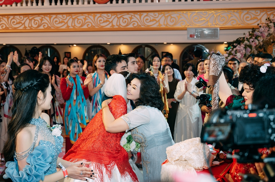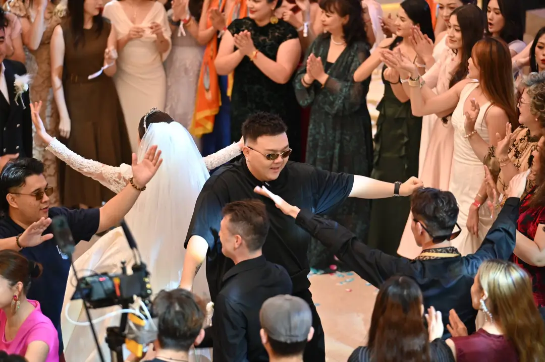 不仅如此,这场婚礼秀还吸引了众多明星大咖。歌手曹方被艾德莱斯绸上杜鹃鸟羽纹路等视觉细节深深吸引,手机拍照根本停不下来;唱作人吕彦良,虽自称“i 人”,但在现场律动的感染下,也忍不住翩翩起舞,疲惫瞬间转化为能量。冬不拉第三流派第三代传承人阿依巴尔・都曼,用指尖流淌出的《可爱的一朵玫瑰花》,为婚礼现场送去了最真挚的祝福。