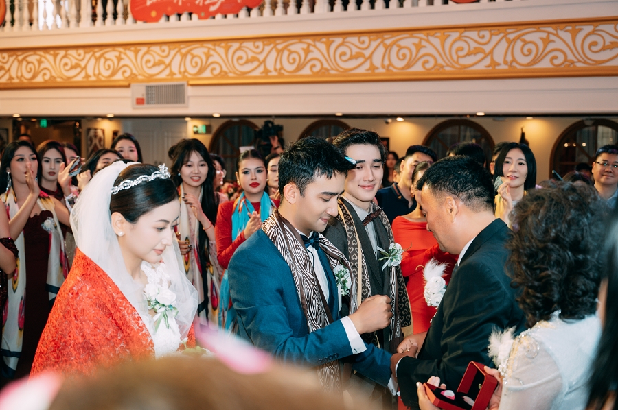 活动现场,当“新郎”率领盛装的迎亲队伍巡游时,沿途的市民和游客都被这炽热的幸福感“狠狠拿捏”,纷纷沉浸其中。仪式核心区,长辈们手持折叠精美的丝巾,郑重地赠予女性宾客,这小小的举动,满是对新人的美好祝福。而最最动人的,当属揭纱时刻,新母亲轻轻掀起“新娘”的头纱,为她佩戴首饰,那一刻,象征着新娘正式成为家庭成员,双方父母深情拥抱新人并亲吻面颊,浓浓的亲情瞬间“破防”了在场的每一个人。