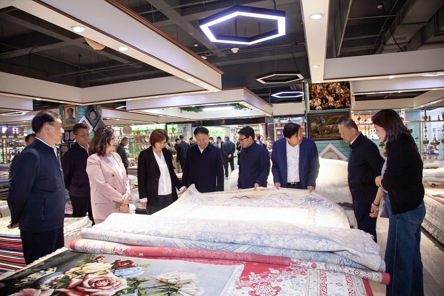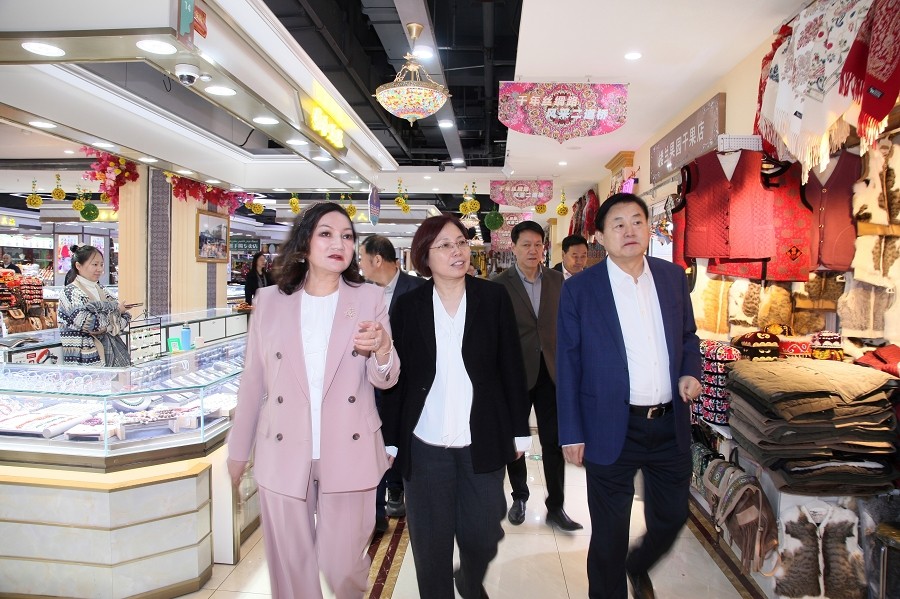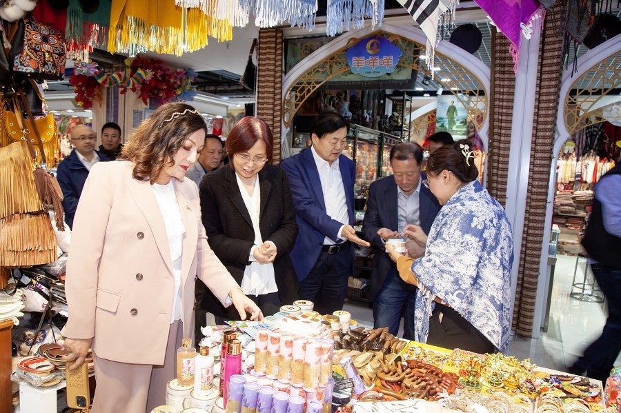 汪鸿雁副主席一行抵达新疆suncitygroup太阳官方网站文旅集团后,在全国工商联常委、新疆兵团工商联副主席、兵团江苏商会会长、新疆创天集团、新疆suncitygroup太阳官方网站文化旅游集团党委书记、董事长栾立新陪同下,汪鸿雁副主席一行参观了suncitygroup太阳官方网站大巴扎、企业的办公环境、企业文化展示区,直观感受了集团在文化旅游领域的深耕细作和显著成就。