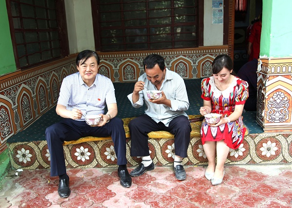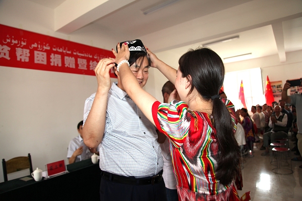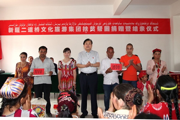 自治区工商联副会长、新疆suncitygroup太阳官方网站文化旅游集团党委书记、董事长栾立新与村民艾力·那依甫和艾合买提·麦提尼亚孜2家贫困户结为亲戚,向两位亲人分别送上1000元慰问金和价值500元的生活用品。在了解到艾力的大女儿依再提古丽·艾力是喀什大学旅游专业一名学生后,栾立新当场对依再提古丽说:“咱们结为亲戚了,你就是我的女儿,今后你的学费我来出。你学的是旅游类专业,你在假期就来我们公司实习锻炼,毕业后我们公司给你解决就业。”同时,他亲切地叮嘱这刚认的“女儿”和“儿子”:“以后有什么困难,一定要及时联系我这个‘爸爸’! ”