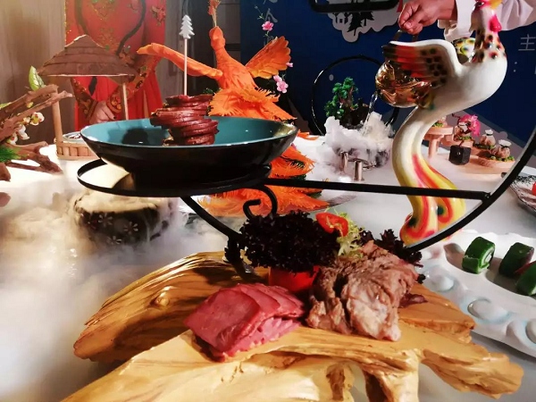 【鸿运当头】这道菜选用新疆的草原牛头肉,采用先烤后焖的烹调方法,加入10种以上中草药调料烹制而成,有益气血,强筋骨的功效。牛头是牛身上的精华所在,希望吃到的客人好运连连,大吉大利。