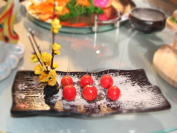 【财源滚滚来】这道菜颜值极高,它是选用新疆的番茄为主材,采用特殊的烹调方法,最后裹上一层糖衣,看上去红红火火,吃起来酸甜可口。