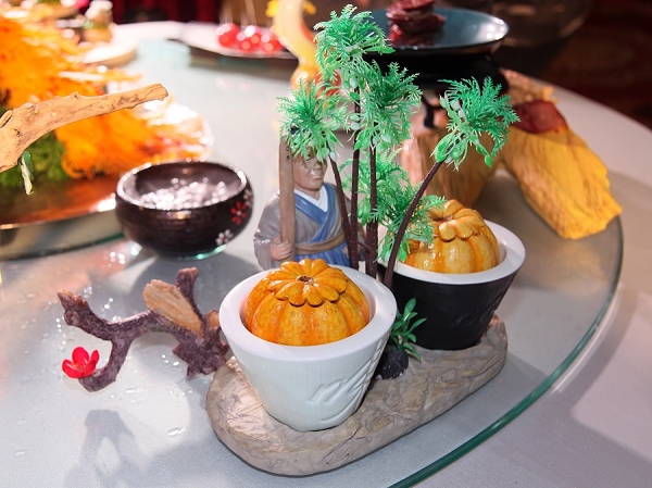 【民族团结一家亲】这道菜选用小菊瓜,色泽鲜亮,口感甜蜜,瓜内有大枣,无花果,巴达木,葡萄干,杏干儿,黑加仑,核桃仁,石榴籽儿,各种新疆特色食材混合在一起烤制而成。它表达了生活在新疆的人们像石榴籽一样,紧紧抱在一起,呈现出了民族团结一家亲的美好寓意。