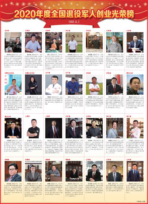 崔洪金,曾服役4年。1988年创建天津安达集团,主营现代物流、机械制造、电子信息、生物医药。获全国劳动模范、天津市最美退役军人、退役军人创业先进人物等荣誉称号。公司创办30多年来,累计吸纳退役军人500多人就业。
