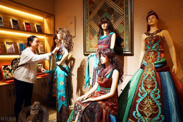 除了静态的展示,非遗文创馆还为游客准备了精彩的动态表演。新疆的歌舞向来是这里的亮点,演员们身着盛装,载歌载舞,为观众带来了一场视听盛宴。观众们沉浸在这欢乐的氛围中,情不自禁地跟着节奏摇摆。