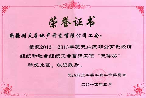 创天集团党委、工会分别荣获2012—2013年度天山区非公有制经济组织和社会组织党建、工会目标工作“三等奖”。