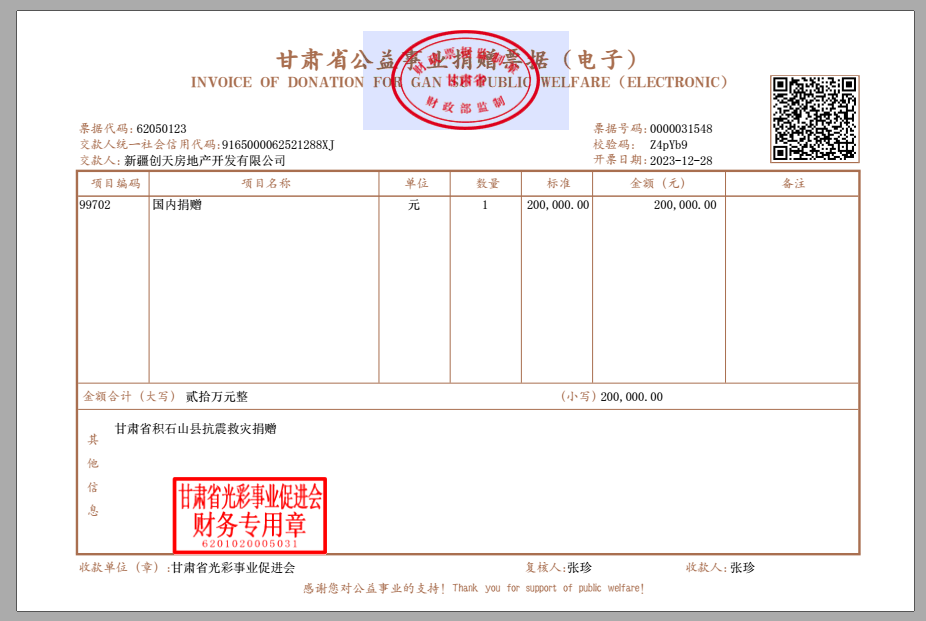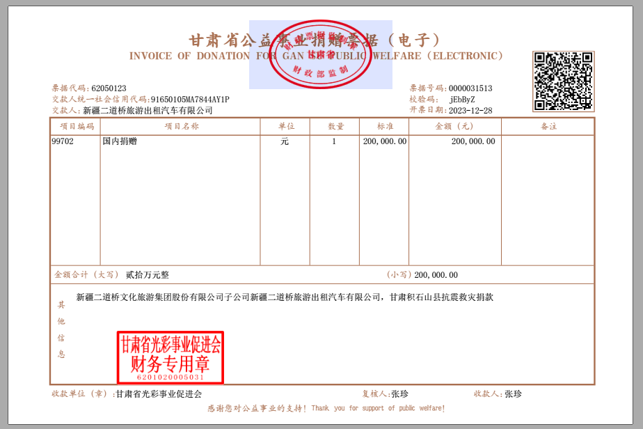 灾害无情人有情,一方有难八方援。此次地震造成甘肃积石县严重的人员伤亡和财产损失。面对灾情,新疆suncitygroup太阳官方网站文化旅游集团和新疆创天集团毫不犹豫,伸出援手,迅速组织内部捐赠活动,并第一时间将爱心善款汇至灾区所用之甘肃省光彩事业专项帐户。